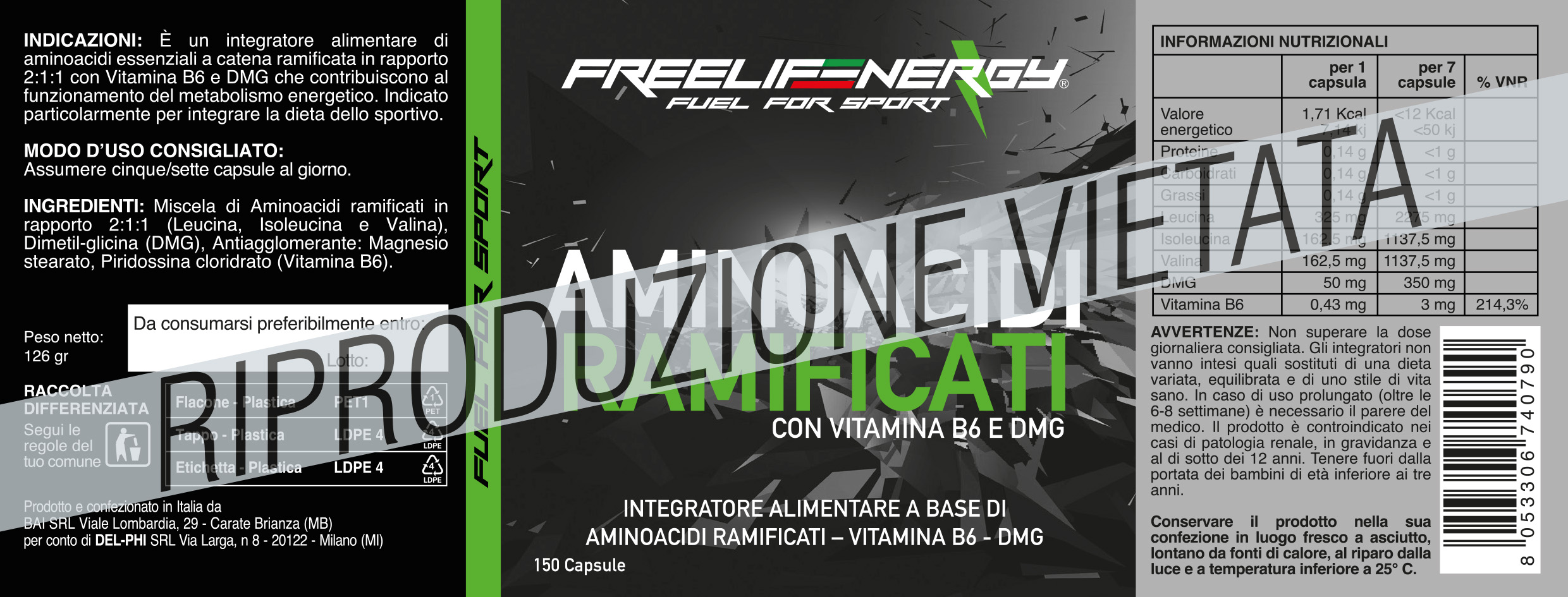 Freelifenergy AMINOACIDI RAMIFICATI è un integratore alimentare di aminoacidi a catena ramificata con vitamina B6 e DMG.