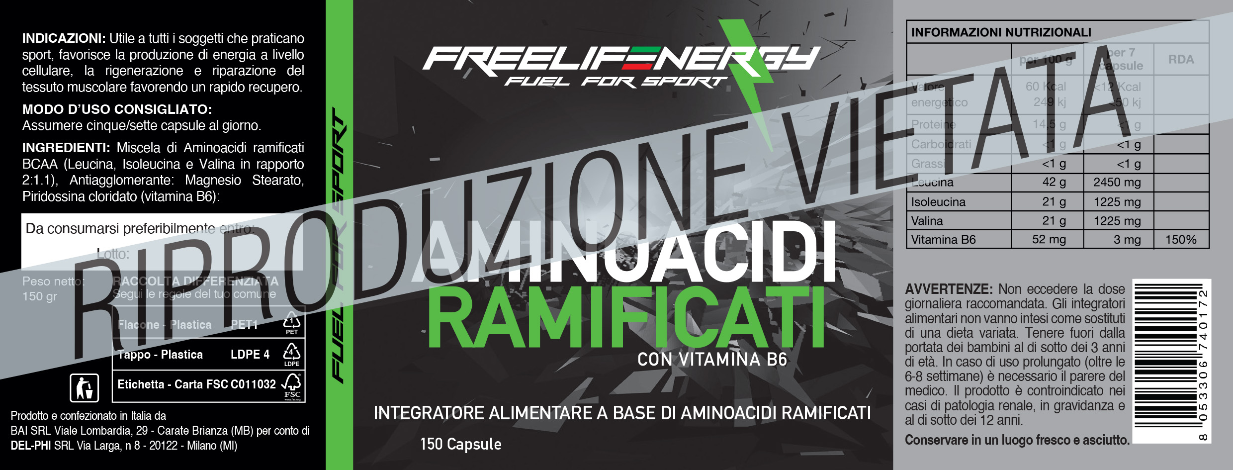 - Rapporto 2:1:1 tra L-leucina, L-isoleucina, L-valina, ideale per favorire la sintesi proteica senza indurre l'eccessiva ipertrofia