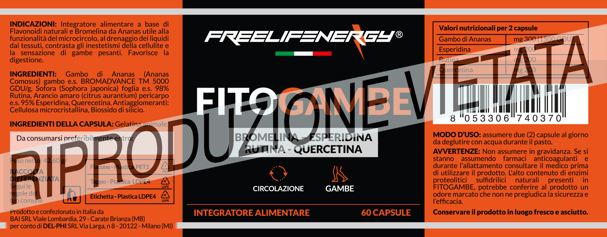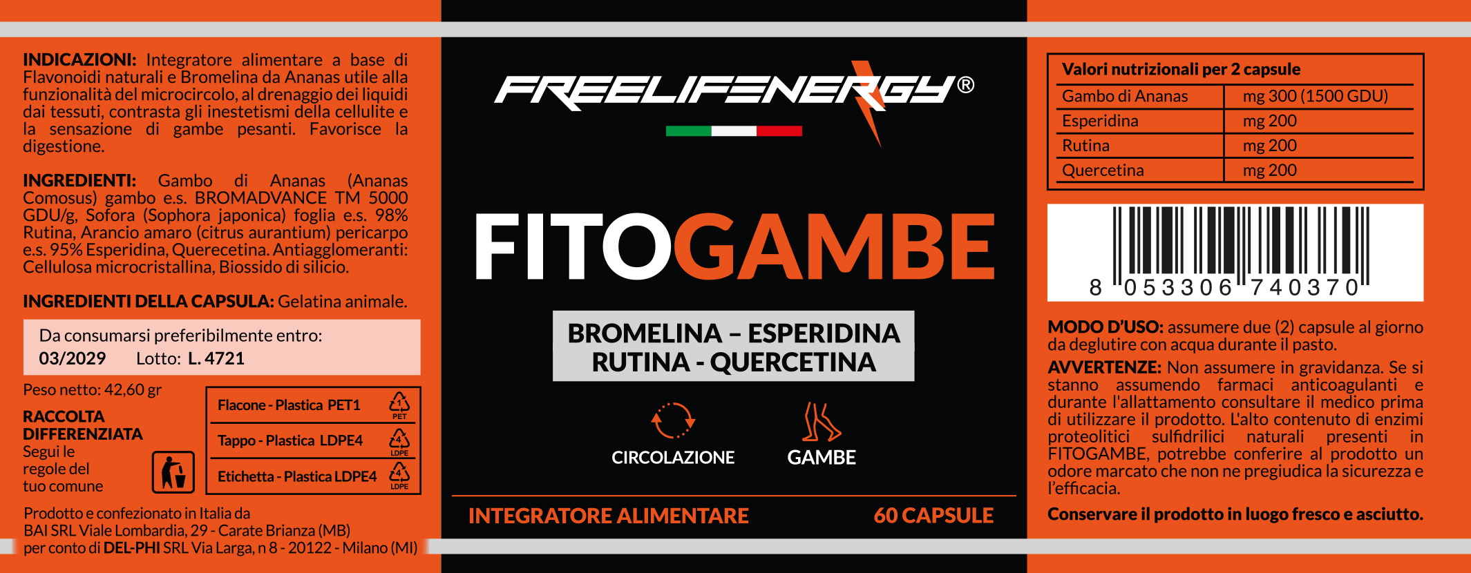 FITOGAMBE Freelifenergy è un integratore alimentare a base di Estratto Secco ad alta concentrazione standardizzato di: ANANAS (Ananas Comosus L. Merr.) e.s. BROMADVANCE TM titolato in BROMELINA 5000 GDU/g, SOFORA (Sophora japonica) e.s. 98% RUTINA, ARANCIO AMARO (Citrus Aurantium) pericarpo e.s. 95% ESPERIDINA e QUERCETINA.